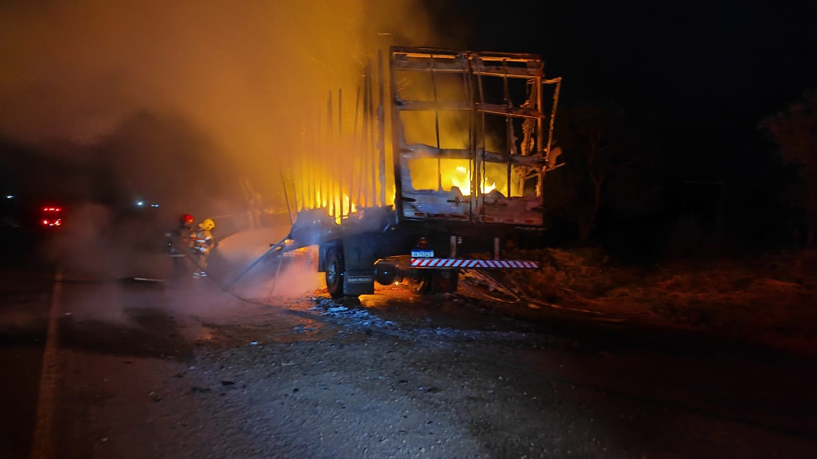 Ao chegar ao local, a equipe de bombeiros constatou que o caminhão, que se encontrava às margens da rodovia, estava completamente tomado pelas chamas. Imediatamente, os militares iniciaram as ações de combate ao incêndio, adotando medidas de segurança, como o isolamento da área e a utilização de Equipamentos de Proteção Individual (EPIs), além de ferramentas adequadas e técnicas específicas para o controle das chamas. O trabalho dos bombeiros para extinguir o incêndio durou cerca de uma hora, sendo utilizados aproximadamente 3.500 litros de água.