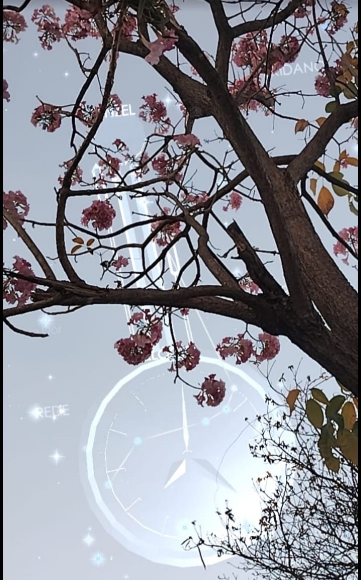 Ilustra a coluna parte da copa de um ipê-rosa localizado no Bairro São Luiz, Montes Claros, MG, tendo, ao fundo, a Constelação do Relógio, uma das 14 constelações modernas idealizadas pelo astrônomo francês Nicolas-Louis de Lacaille (1713–1762).