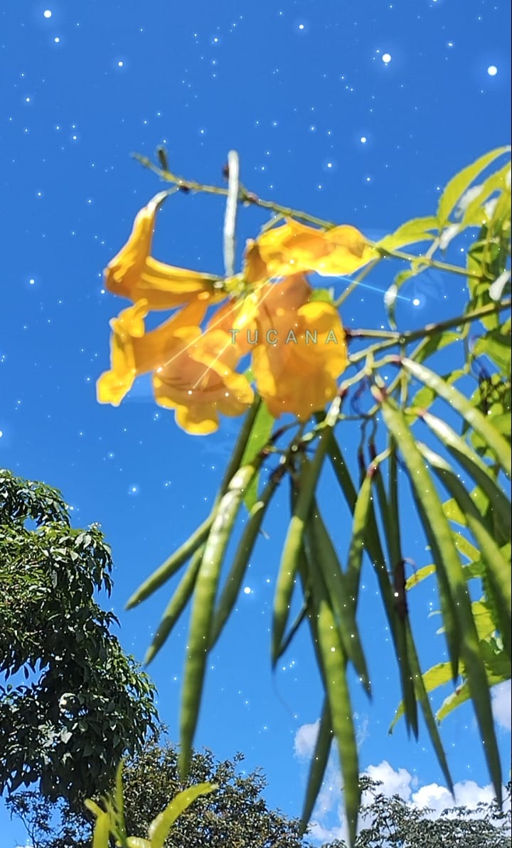 O céu do meu bairro: O outono não tem a ornamentação do ipê-amarelo (Handroanthus albus), que, normalmente, alça suas flores por volta do mês de agosto, mas tem a inflorescência do ipê-de-jardim (Tecoma stans), uma bela espécie comumente utilizada na arborização urbana. Na foto, vê-se o registro das flores de um belo ipê-de-jardim localizado em uma calçada de Montes Claros. O azul do céu diurno, ao fundo, sustenta o amarelo-ouro e o verde, formando uma composição tricolor. Na direção do cacho de flores, percebe-se a constelação de Tucana. O nome dessa constelação foi uma homenagem do astrônomo alemão Johann Bayer (1572–1625) ao tucano, ave encontrada nas florestas brasileiras e até mesmo em áreas urbanas próximas a parques florestais. Uma espécie de tucano encontrada no Brasil é o tucanuçu (Rhamphastos toco).