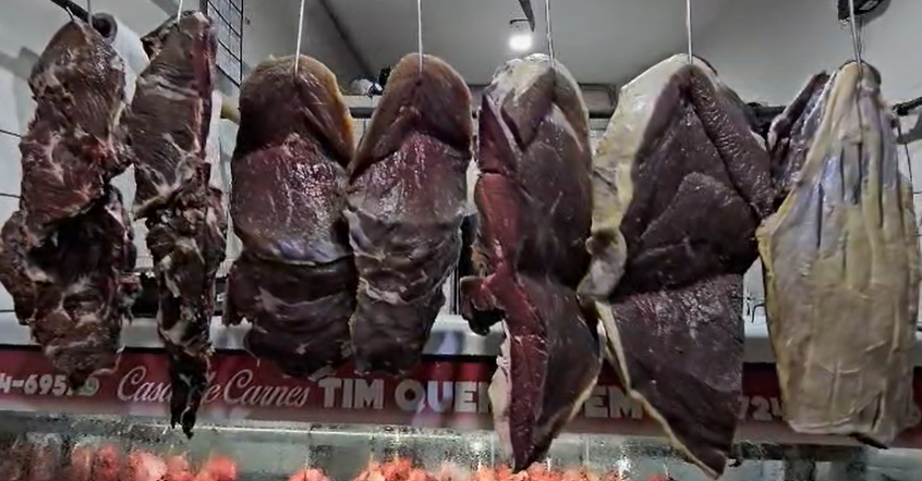 O setor de carnes é um dos mais simbólicos. A famosa carne de sol, bem curada, passa pelo processo tradicional: a carne fresca recebe o sal na medida certa e “curte” no tempo exato até se transformar no produto que é símbolo da região. A carne marmorada chama atenção pela qualidade, enquanto os cortes suínos — costela, lombo, pernil, toucinho e pele para torresmo — garantem presença constante nas sacolas dos fregueses.