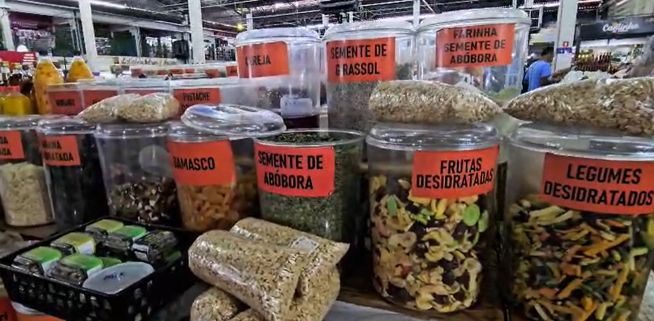 Ao redor, multiplicam-se as lojas de produtos naturais: castanhas, sementes, farinhas integrais, frutas secas e cristalizadas, temperos e condimentos variados. Fernanda mantém viva uma loja que pertenceu à mãe e está no mercado há mais de 40 anos. Ali, vende produtos naturais, itens para pré-treino, petiscos, temperos e condimentos, atraindo desde atletas até quem busca uma alimentação mais saudável.