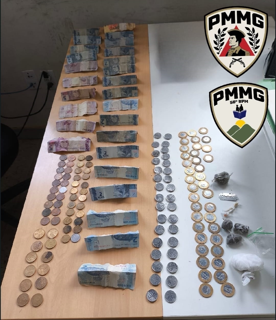 Enquanto isso, o jovem de 18 anos retornou rapidamente para dentro da residência antes de ser abordado. Os policiais se deslocaram até o imóvel e fizeram contato com a avó do suspeito, que autorizou formalmente a entrada da equipe. Durante buscas no quarto do jovem, os militares localizaram uma quantidade expressiva de materiais ilícitos, sendo apreendidos uma porção grande de substância semelhante à cocaína, uma porção grande de substância semelhante à maconha, três buchas de substância semelhante à maconha, além de R$ 150,30 em dinheiro, embalagens utilizadas para fracionamento e venda de drogas, uma lâmina de gilete e uma pedra de substância semelhante ao crack, encontrada próxima à porta da residência.