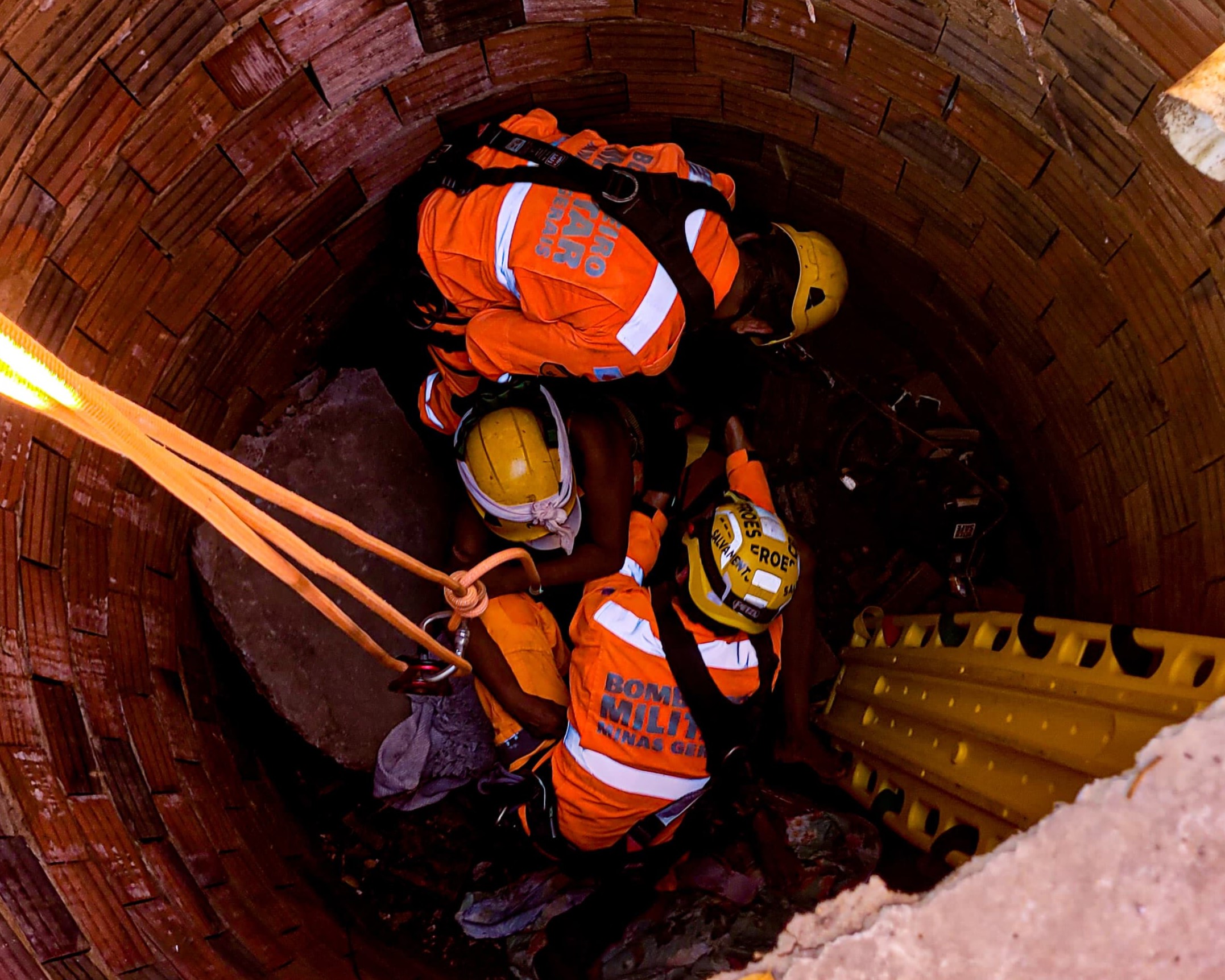 Após avaliação da cena e análise de riscos, foi montado um sistema de ancoragem com escada para acesso seguro ao interior da fossa. Durante toda a operação, os militares precisaram atuar com cautela, uma vez que ainda havia risco de desprendimento de estruturas e materiais da borda da fossa, o que poderia atingir tanto a vítima quanto os bombeiros que operavam no interior do espaço confinado.