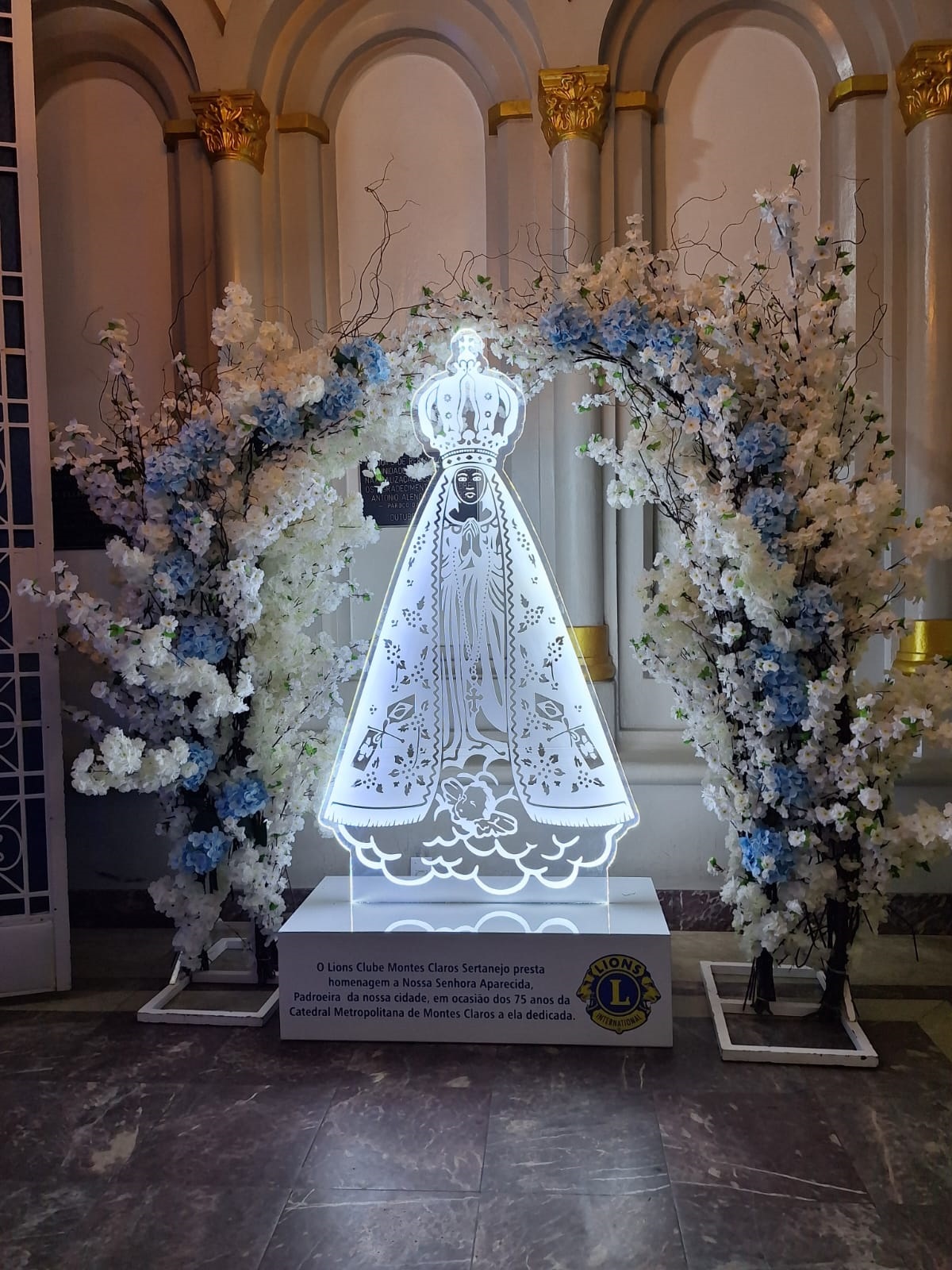 O Lions Clube Montes Claros Sertanejo doou, na noite desta quarta-feira (1º), uma imagem iluminada de Nossa Senhora Aparecida, padroeira de Montes Claros e do Brasil, como parte das comemorações pelos 75 anos da Catedral Metropolitana.