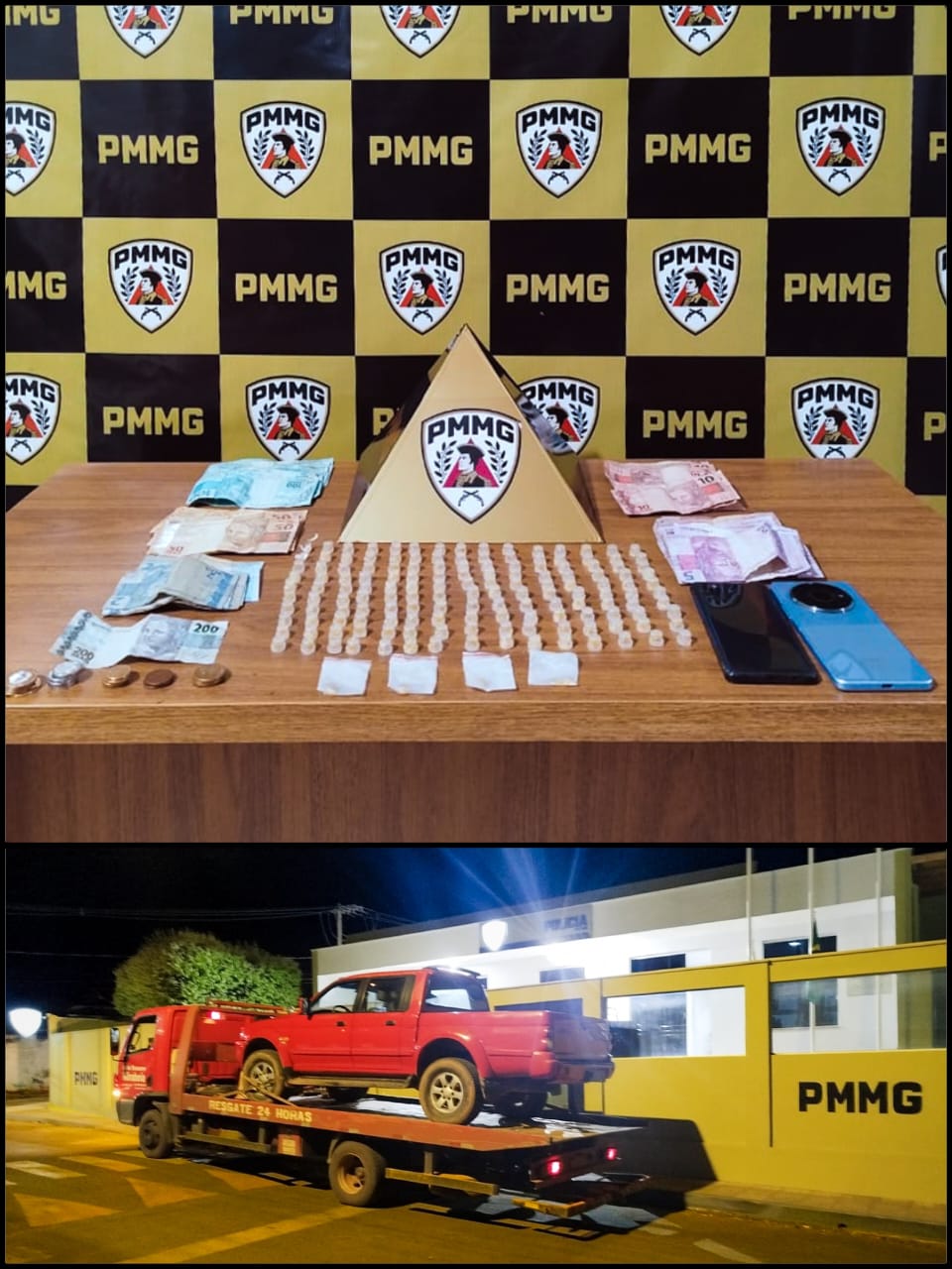 O veículo L200, utilizado no transporte da droga, foi apreendido e removido ao pátio credenciado, permanecendo à disposição da Justiça. Os entorpecentes e o dinheiro apreendido foram recolhidos e encaminhados para perícia técnica, que confirmará a natureza e o peso exato das substâncias.