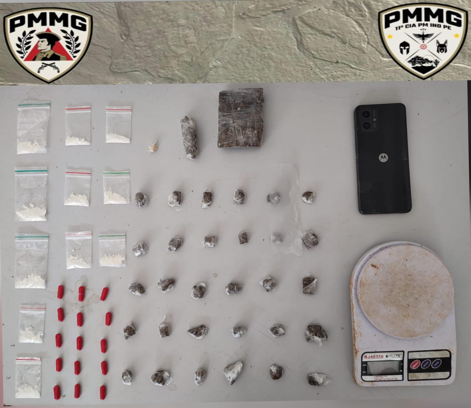 O suspeito informou aos militares que havia mais drogas em um pote branco, em uma mesa na área externa de um imóvel situado na Rua Treze, no mesmo bairro. No local indicado, a equipe localizou o pote mencionado, contendo 20 porções de substância semelhante a maconha, um tablete maior da mesma droga, uma porção petrificada de substância semelhante a crack e 15 comprimidos vermelhos feitos de substância semelhante a cocaína, além de uma balança digital.