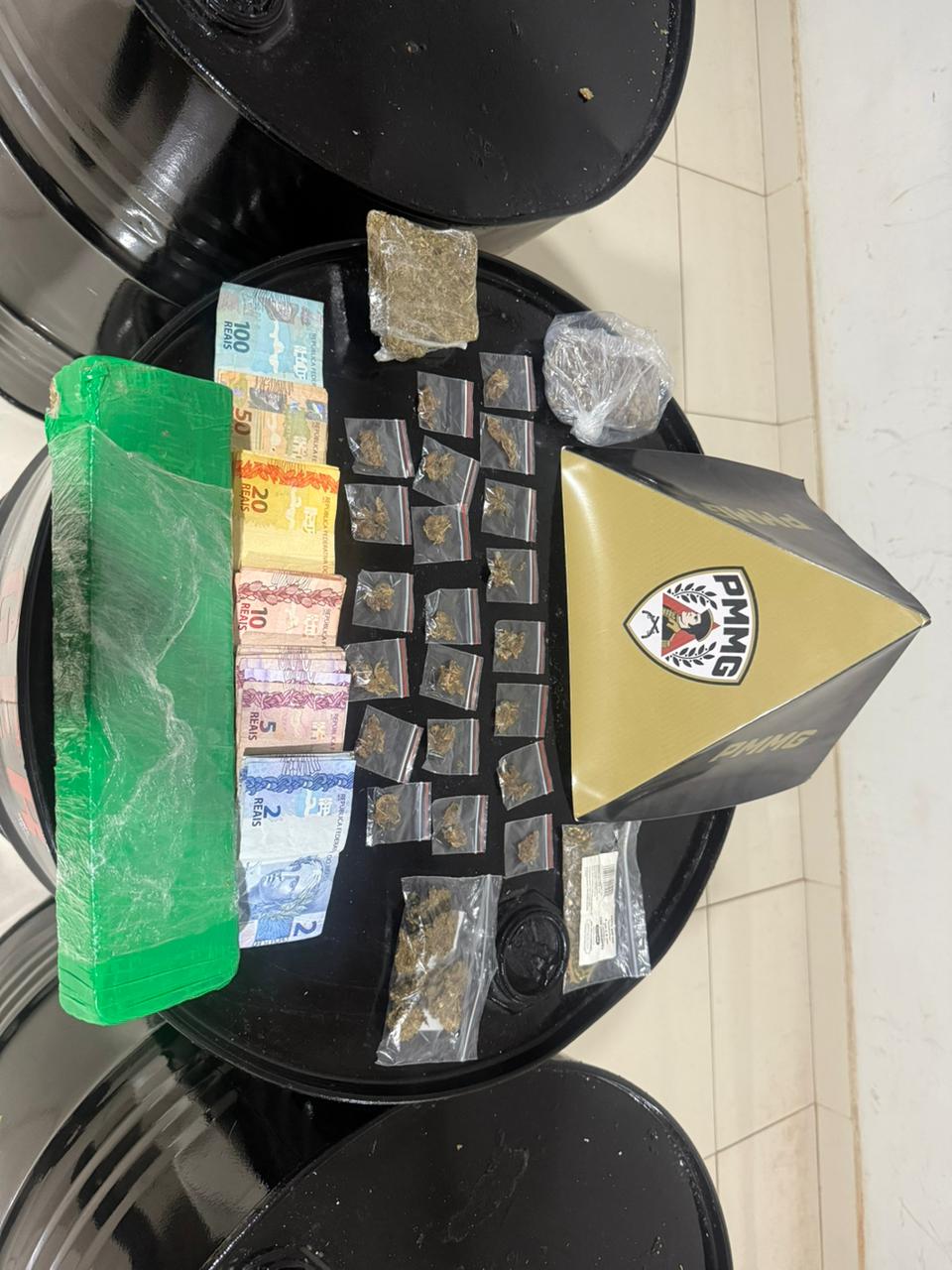 Durante a fuga, os suspeitos abandonaram diversos materiais, que foram recolhidos pelos militares. No interior da residência alvo da denúncia e em suas imediações, a Polícia Militar apreendeu uma barra de substância semelhante à maconha, duas porções da mesma droga e 21 buchas de maconha, todas prontas para a comercialização. Além dos entorpecentes, também foi encontrada a quantia de R$ 1.838 em dinheiro, valor que, segundo a PM, é compatível com a prática do tráfico de drogas.