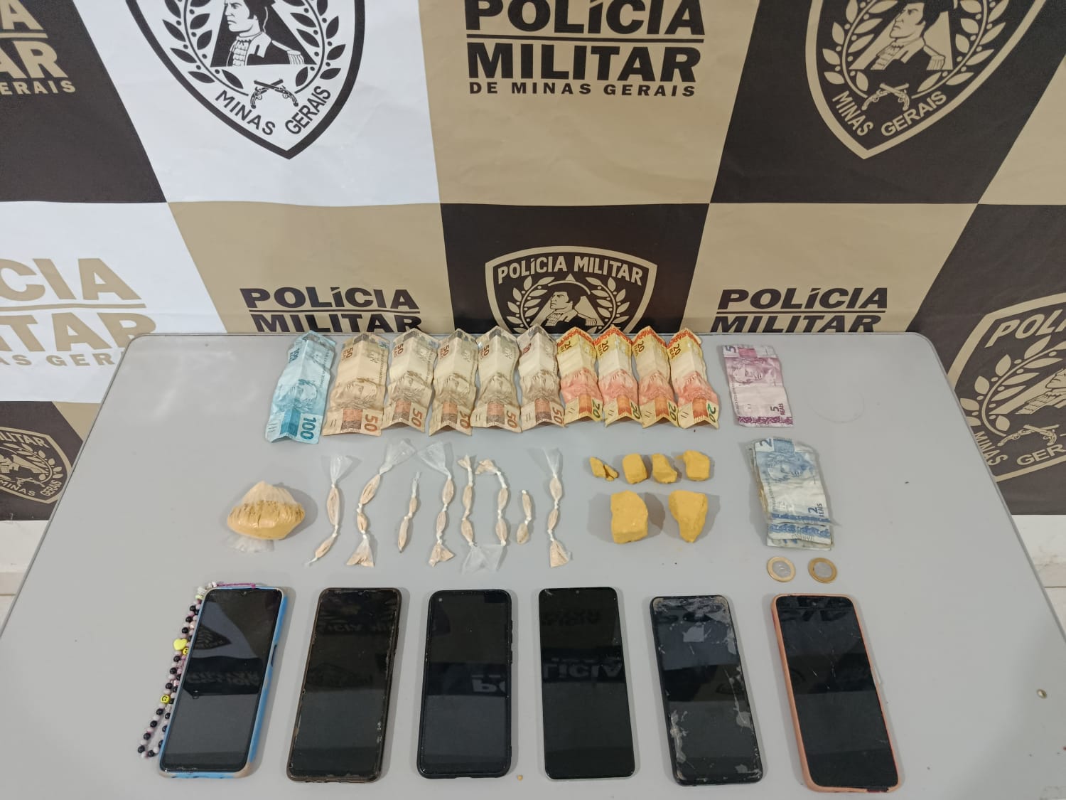 Durante as buscas na residência alvo da denúncia, os militares localizaram entorpecentes tanto sobre uma mesa na área dos fundos quanto enterrados no quintal do imóvel. Foram apreendidas duas pedras médias de substância semelhante à cocaína, cinco pedras pequenas da mesma substância, uma porção de substância semelhante à cocaína em pó, 21 papelotes de substância semelhante à cocaína, além de R$ 449,00 em dinheiro e seis aparelhos celulares, que podem auxiliar nas investigações sobre a dinâmica do tráfico na região.
