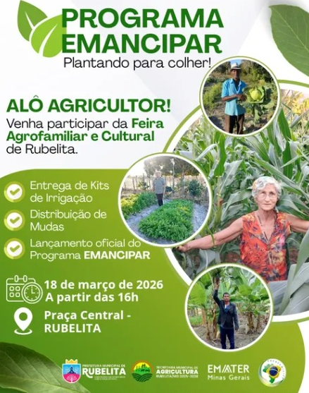 A Prefeitura de Rubelita realiza, no próximo dia 18 de março, a Feira Agrofamiliar e Cultural, iniciativa voltada ao fortalecimento da agricultura familiar e à valorização dos produtores rurais do município. O evento terá início às 16h, na Praça Central da cidade, reunindo agricultores, agricultoras, produtoras e produtores rurais, além de moradores da zona urbana e da zona rural em um momento de integração, reconhecimento e incentivo às atividades desenvolvidas no campo.