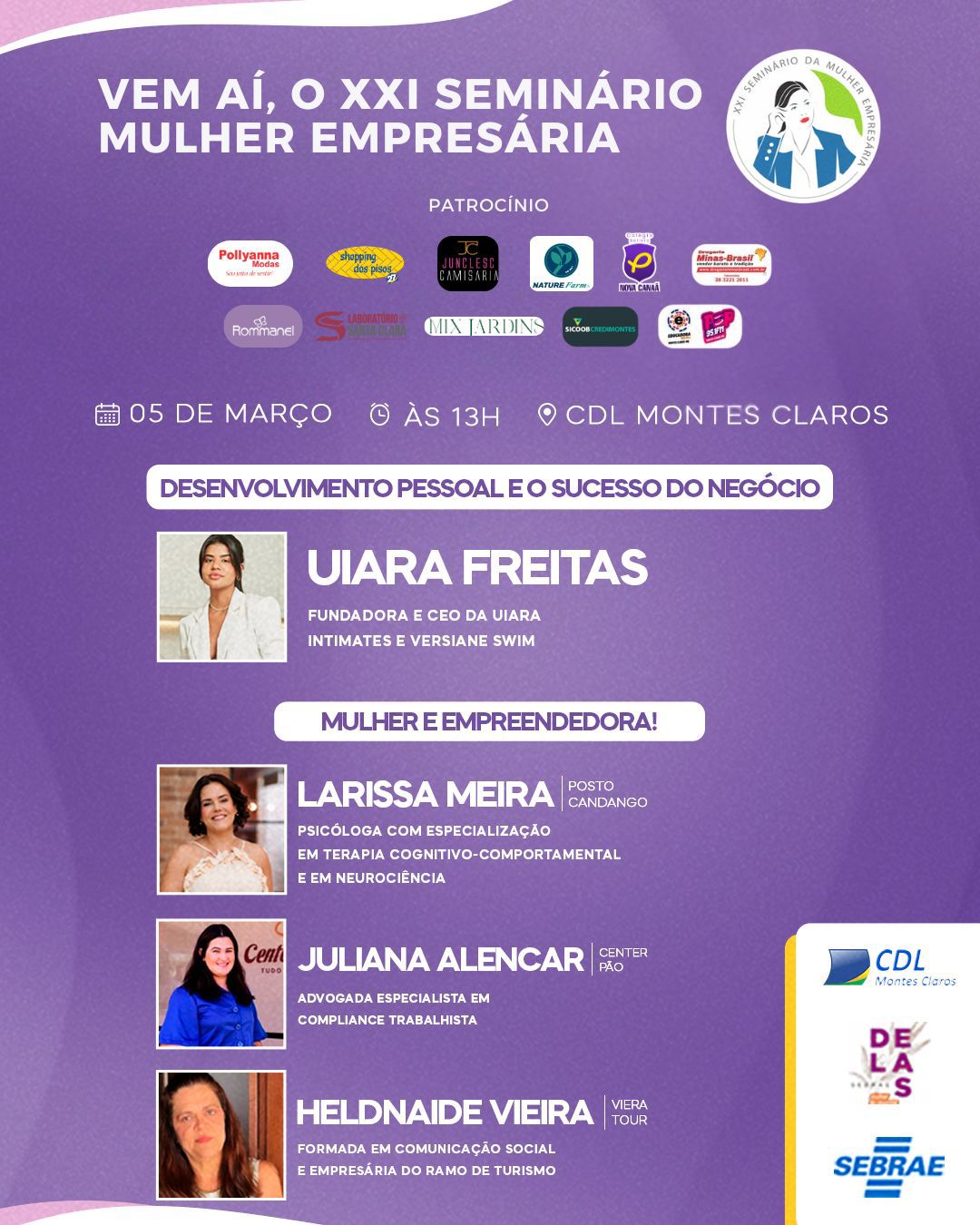 Consolidado como um espaço de valorização, reconhecimento e fortalecimento do protagonismo feminino, o seminário integra as ações do mês dedicado à mulher e reforça a importância crescente da presença feminina na gestão de negócios, na geração de empregos e na construção do desenvolvimento econômico sustentável de Montes Claros e do Norte de Minas.